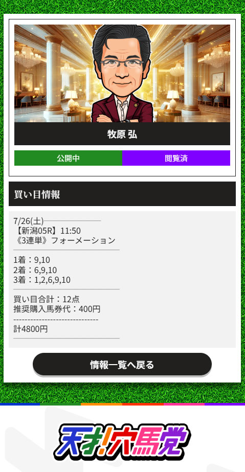 ※利用者の多い、「天才!穴馬党」競馬リポート内の口コミを確認たところ、会員様も直近で「牧原 弘」馬券師、有料情報を利用して100万円越え払い戻しの実績を残しており、これから検証する管理人の田中もですが利用者側から考えるとこういった的中報告は期待が高まりますね。