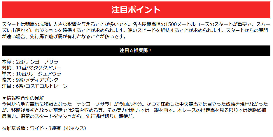 予想は本命から注目までの5頭が選ばれており、推奨券種はワイドと3連複のボックスとなっていました。