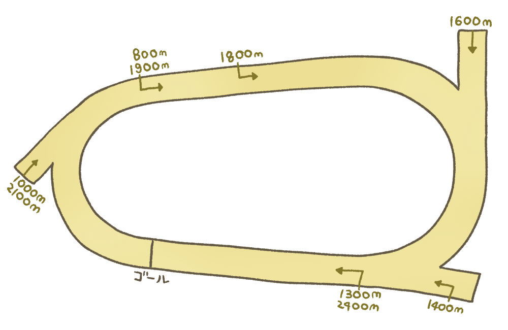 きついコーナーを抜けた後に、向こう正面から緩いコーナーを利用して長いスパートが出来る馬が有利になる。