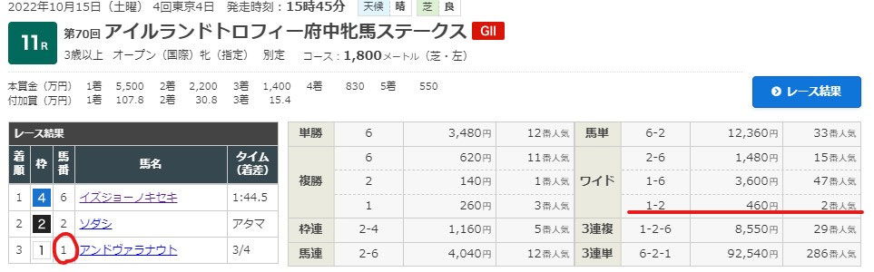 ①アンドヴァラナウトは3着で②ソダシが2着に入り1-2の買い目が的中しました!