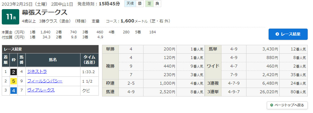 1番人気④ジネストラが1着、⑪ボーデンは7着という結果に・・・