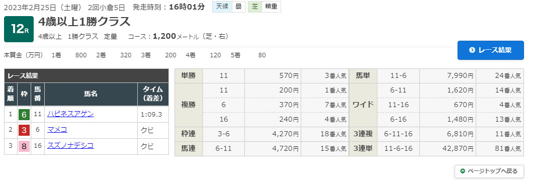15,000円マイナスになってしまいましたが気を取り直して小倉12Rへ。