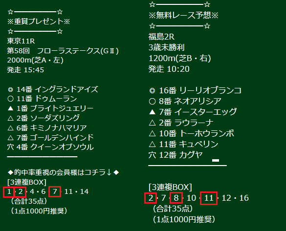 23日(日)フローラS(G2)にて7番人気馬の好走見抜き、