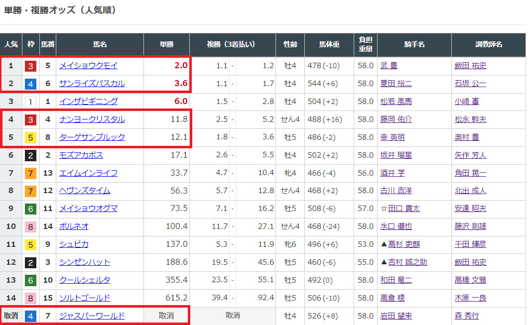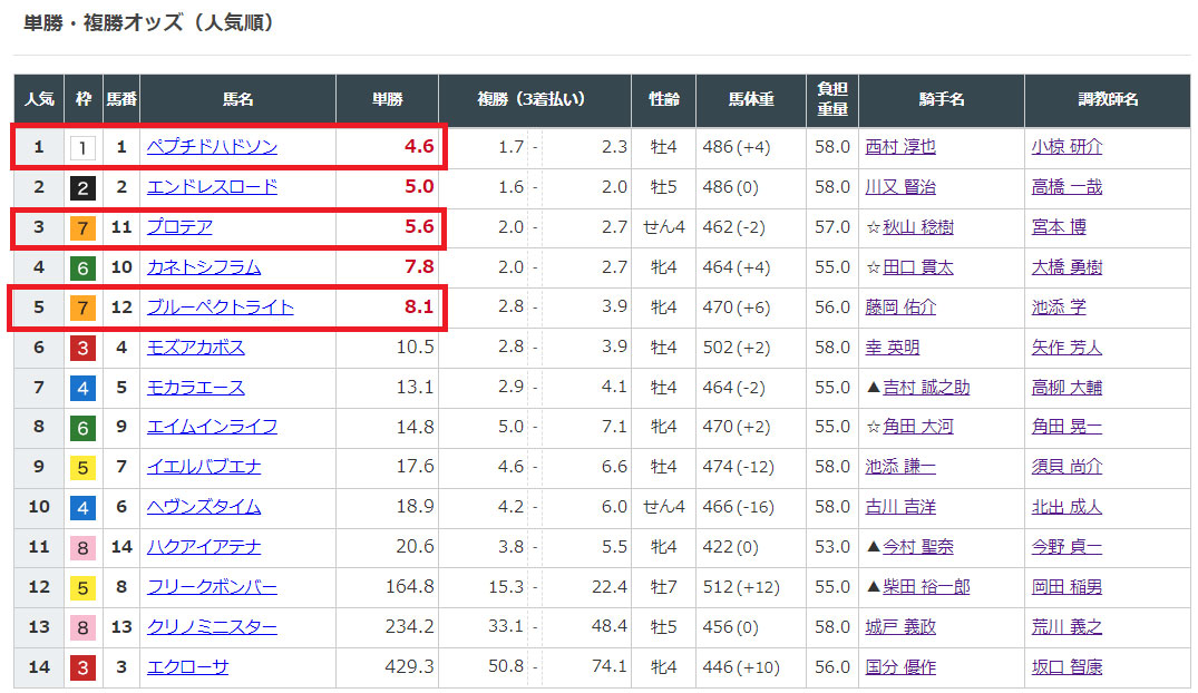 上位人気5頭と10番人気、15番人気の馬を選んでいます。