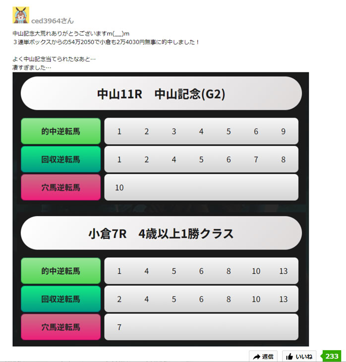 中山記念(G2)も小倉の平場のレースも見事に当てていますね。