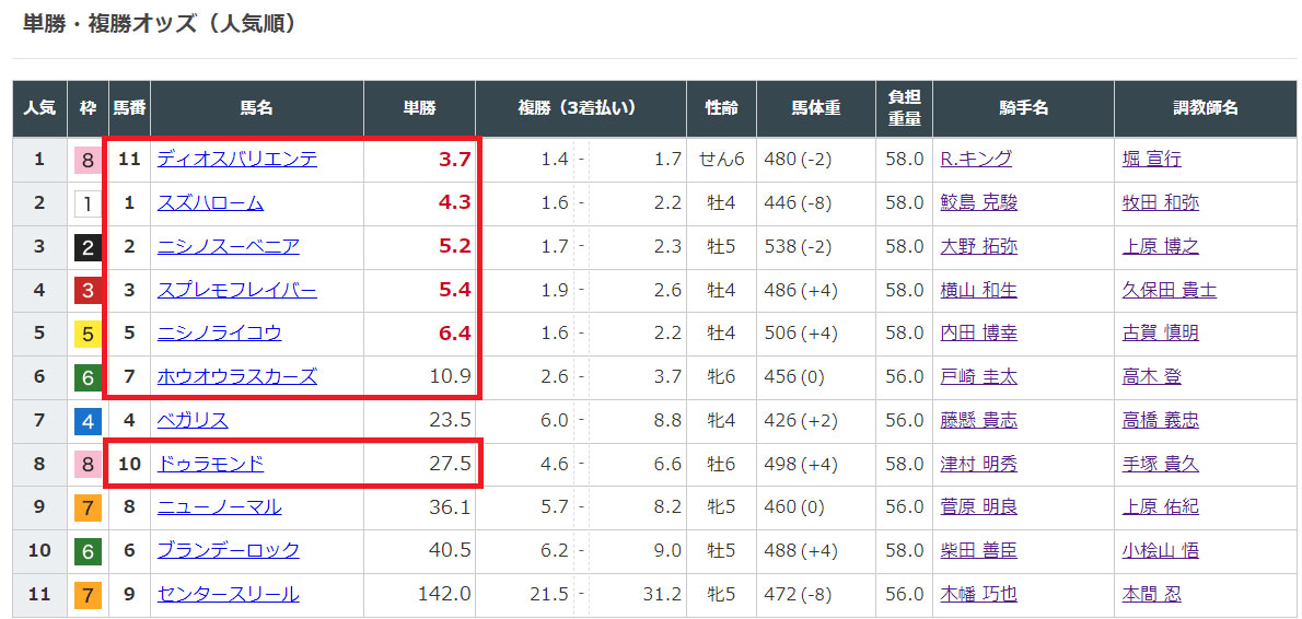 1桁台の馬が11頭中5頭もいるのでオッズが割れているので良い配当に期待したいですね。