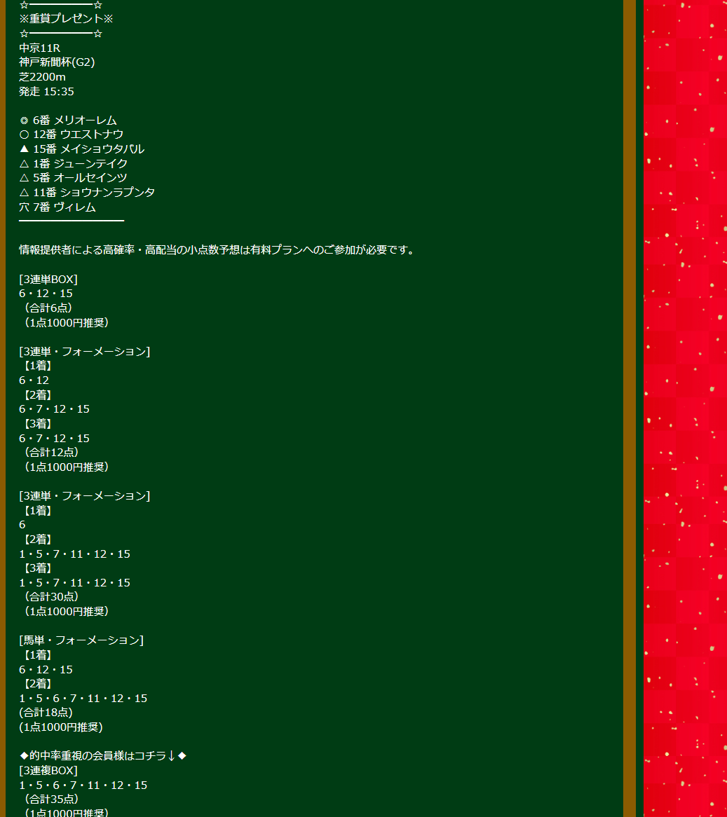 その前の中京2&中山6の無料情報では40万5400円、トータル短日3レースで50万近く稼がせてもらいました。
